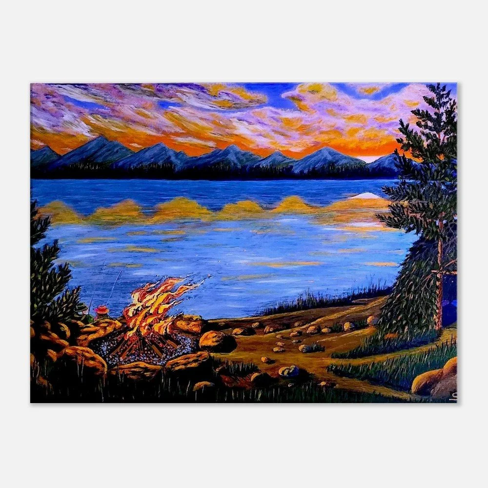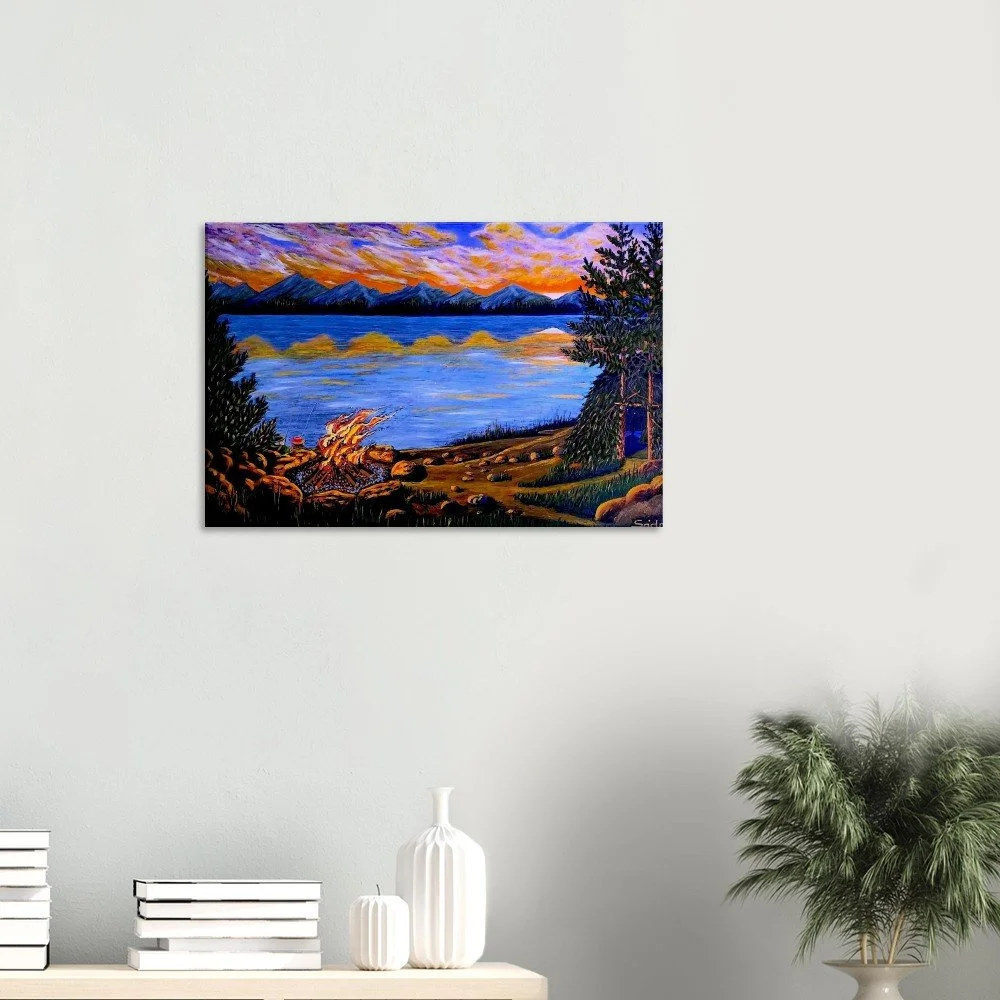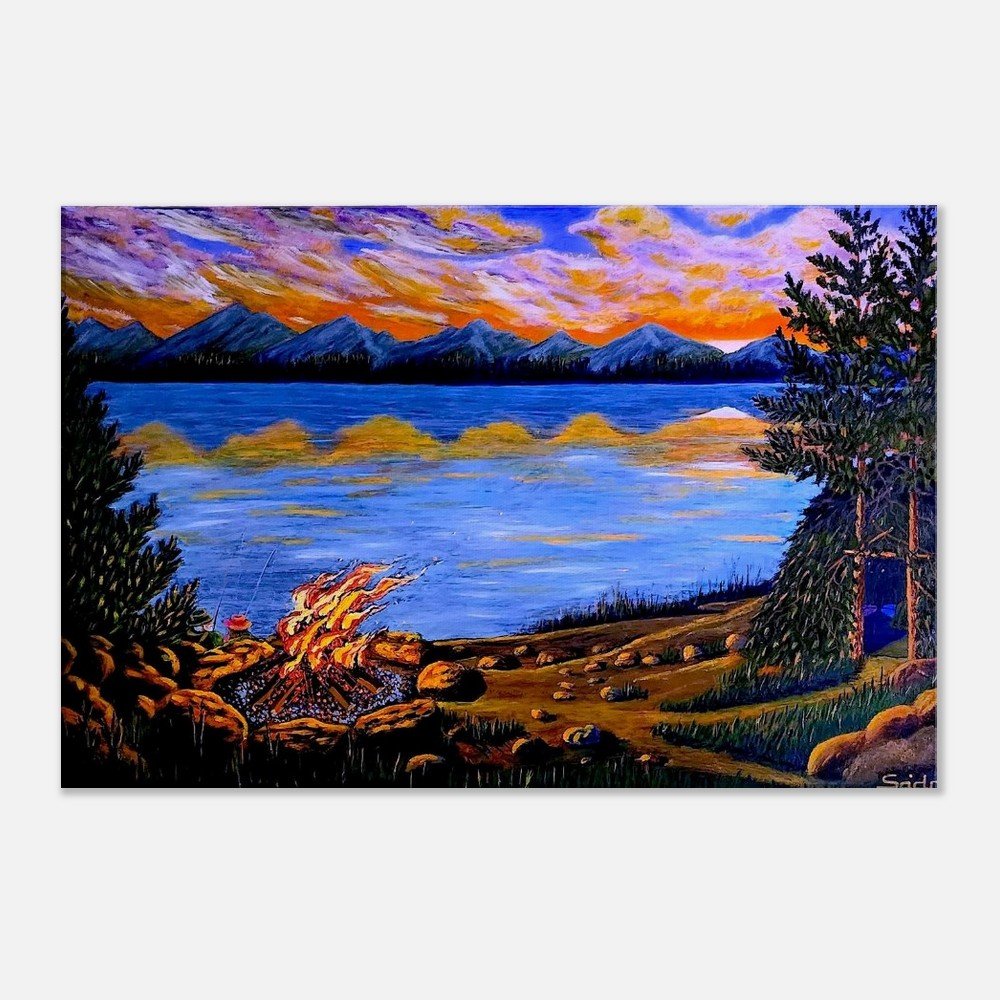 The fire by the water becomes a metaphor for the human soul – burning, yet vulnerable. The mountains on the horizon hold the silent presence of time, and the calm surface of the lake reflects the sky just as the heart reflects what has been experienced.