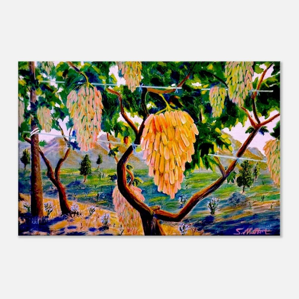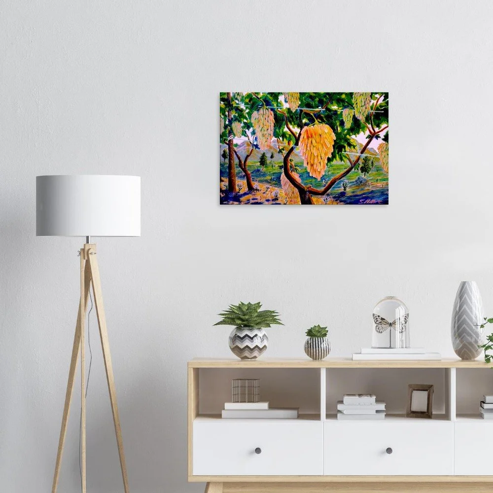 Experience the poetic beauty of nature with our 'Golden Clusters' canvas print. This stunning artwork captures the essence of tranquility, portraying golden grapes that evoke the sweetness of life, illuminated by a harmonious blend of warm ochre, honey tones, deep greens, and azure. The artist masterfully transforms nature into an inner journey, inviting viewers to reflect on the deeper meanings of time and existence.