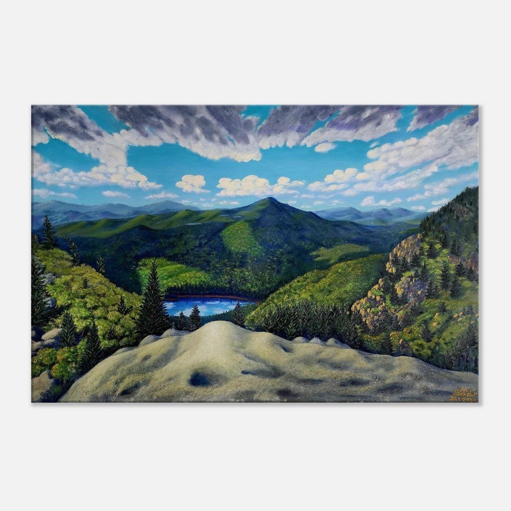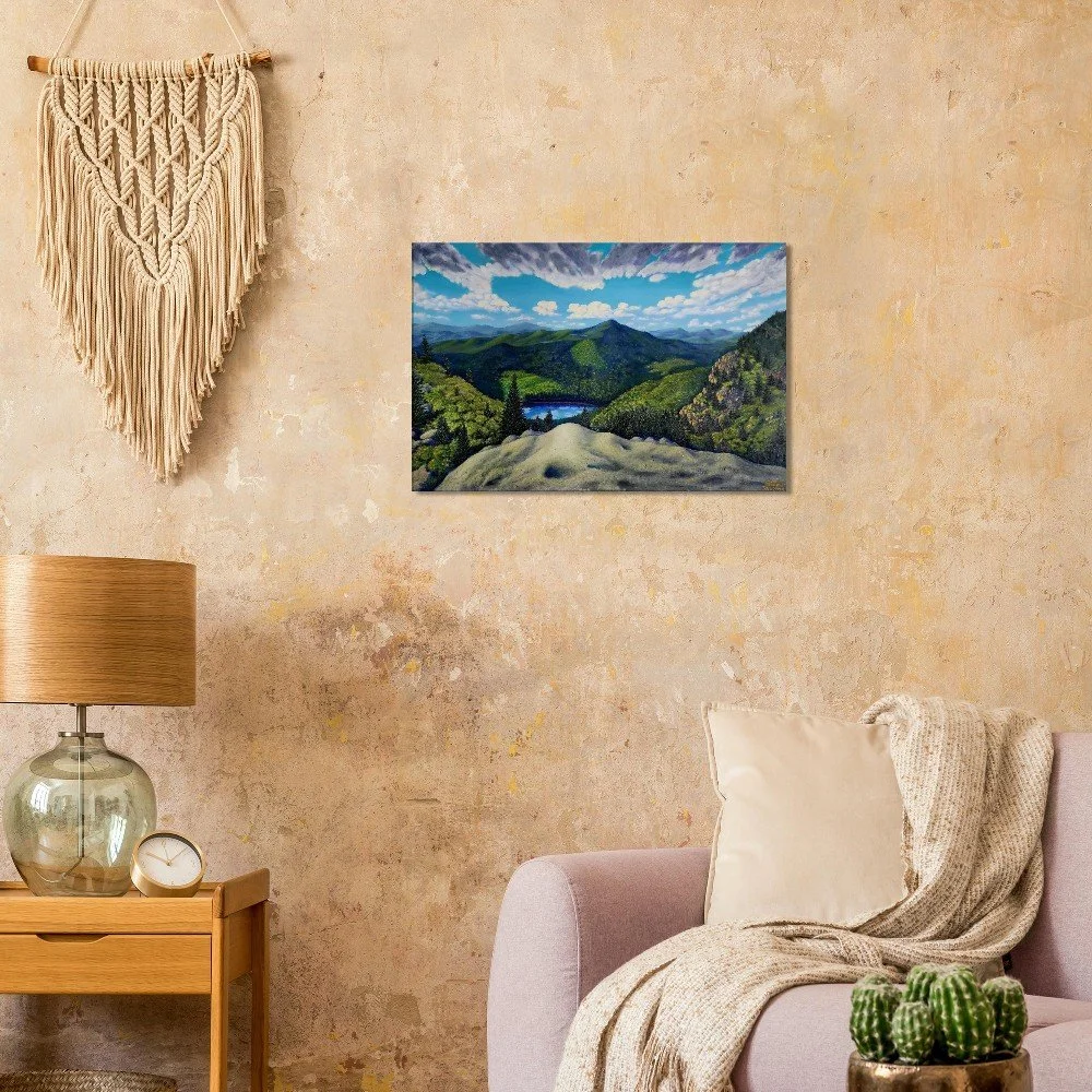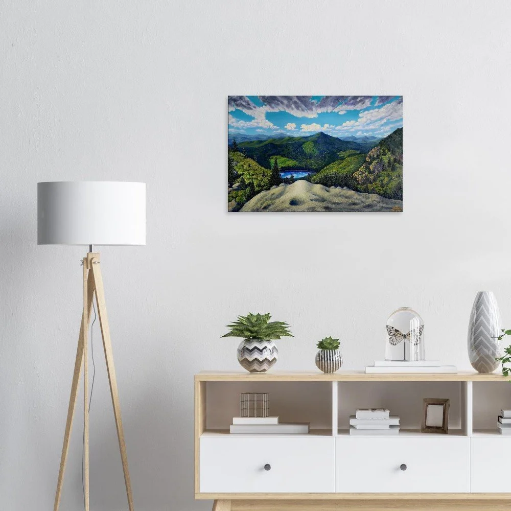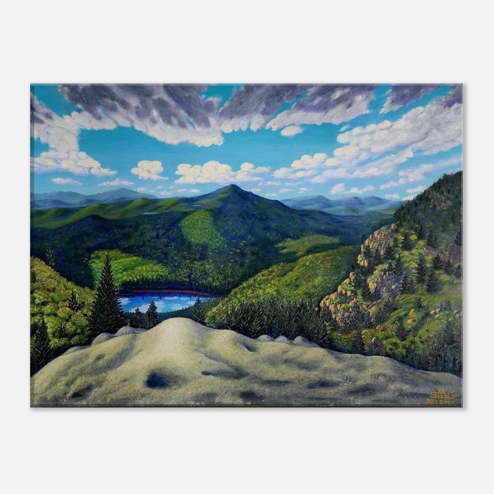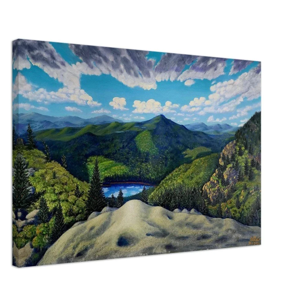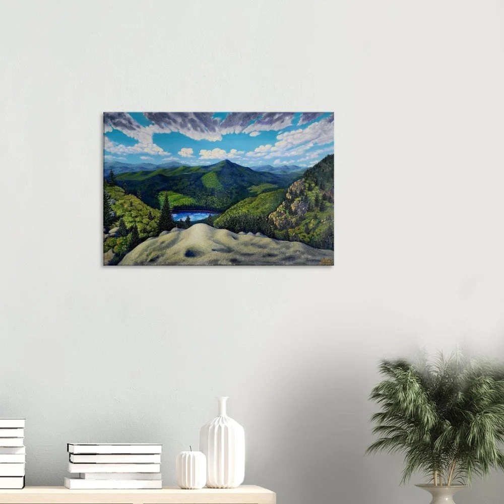 Discover the serenity and sophistication of 'View from Grandfather Mountain', beautifully captured on premium canvas. This timeless piece embodies calm confidence, with each brushstroke reflecting the artist’s profound life experiences and observations. Crafted for art lovers who value rarity and depth, this canvas print transforms any space with its subtle yet impactful presence. Made with responsibly sourced materials, it features a cotton-polyester blend that enhances the artwork's immersive quality. Choose from slim (2cm) or thick (4cm) options, available in 26 sizes to suit any room. This luxurious canvas includes a hanging kit for effortless display, and with no minimum orders, each piece is printed and shipped on demand, ensuring your art is as unique as you are. Elevate your home today!